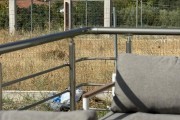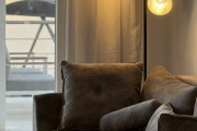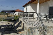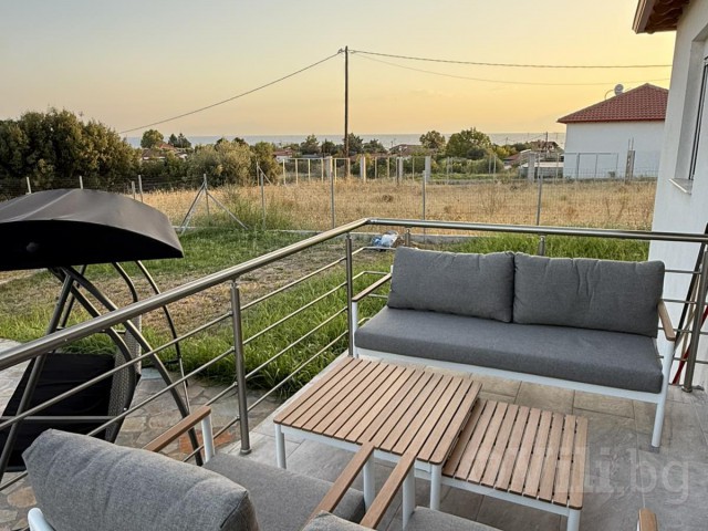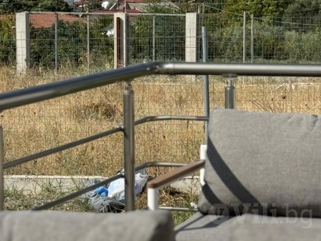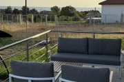 Заградена тераса с градинска мебел и люлка с гледка към морето