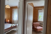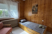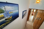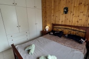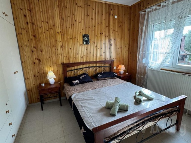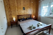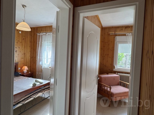 На приземния етаж се намират двете спални - едната е с двойно легло, а другата спалня е с едно единично легло, което става на двойно, на две нива, плюс разтегаел фотьйол. Има възможност за добавяне на още едно разтегателно единично легло.