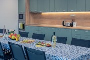Трапезарията е светла и просторна с място за забеления и танци.