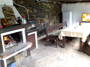 Има механа с камина, кухненска част с посуда за приготвянето на храна.