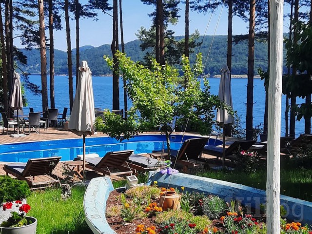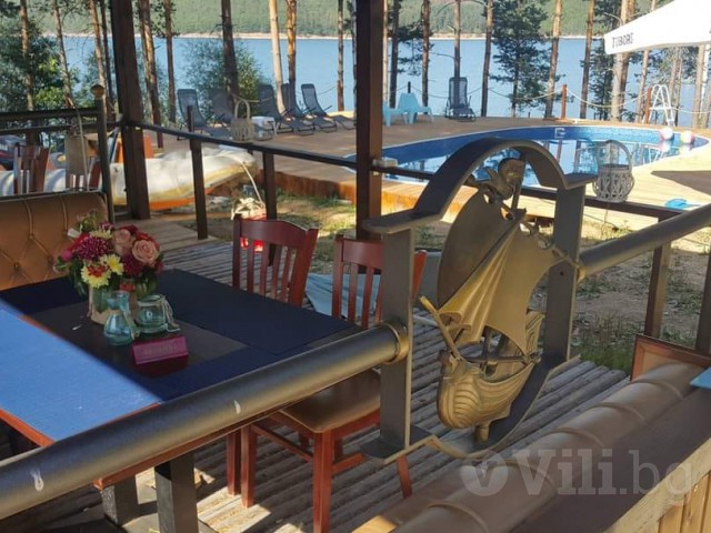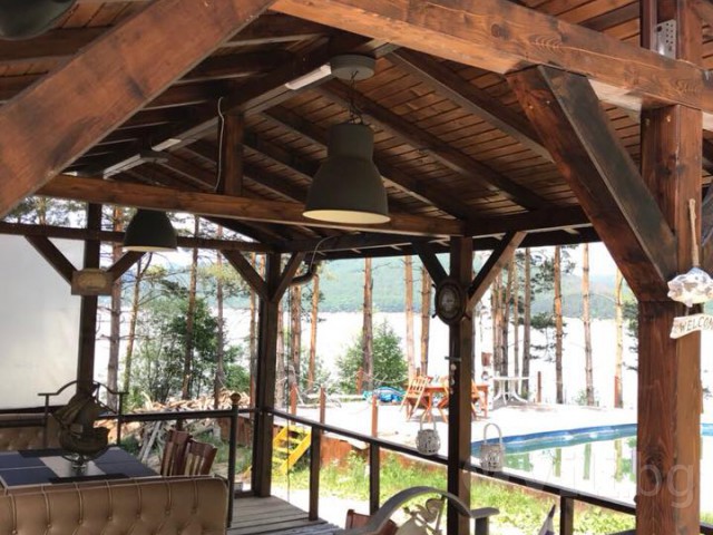 Голяма всекидневна с гредка към езерото, голям телевизор, климатик, камина на дърва, голяма трапезна маса за 22-ма човека и билярд
