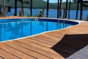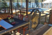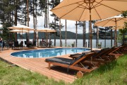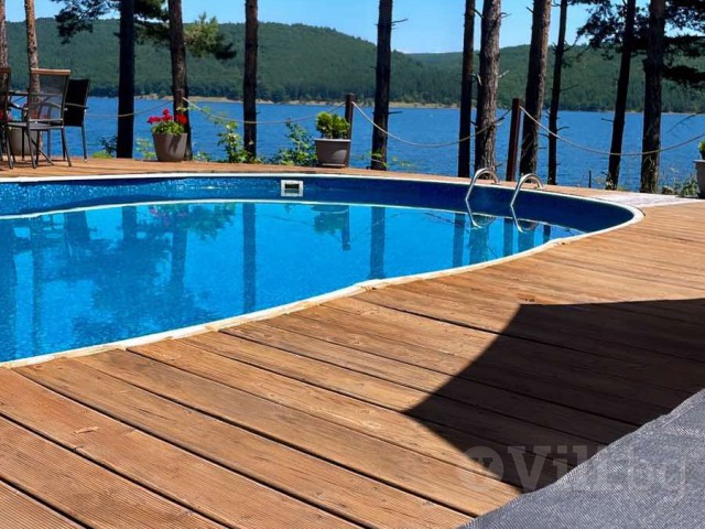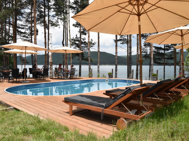 Външен открит отопляем басейн работещ от Май до Октомври с релакс зона от дървени шезлонги, чадъри, маси и столове.
