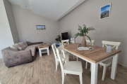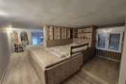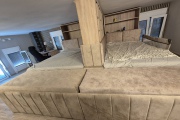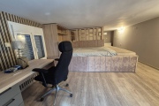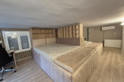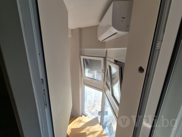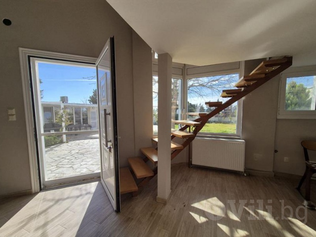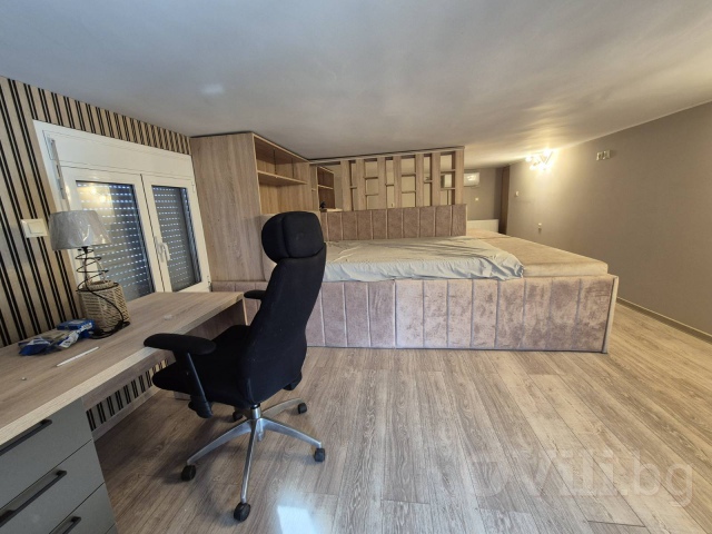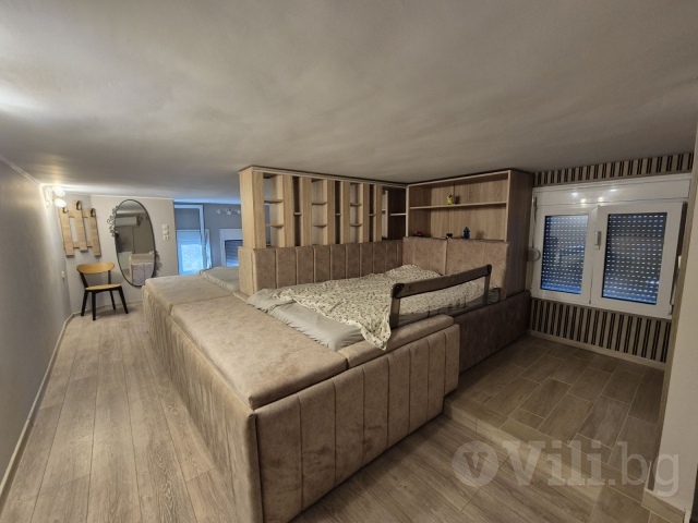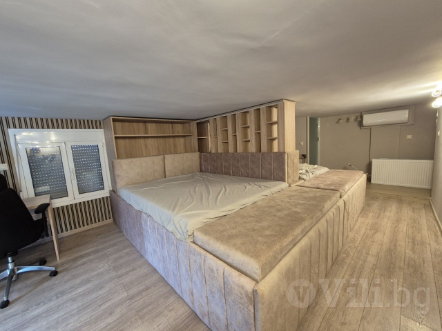 Горният етаж педставлява голямо ателие, в което има две двойни легла, отделени с декоративна преграда, баня и тоалетна. Подходящо е за семейство с две големи деца.