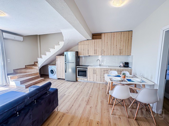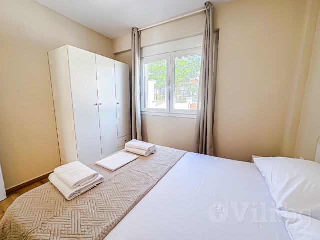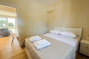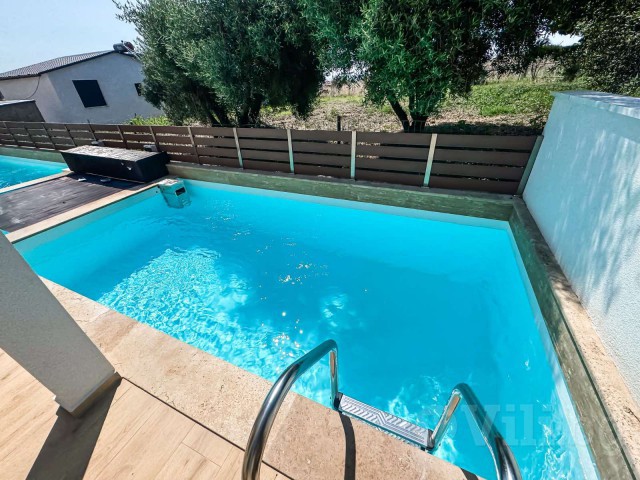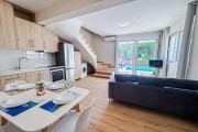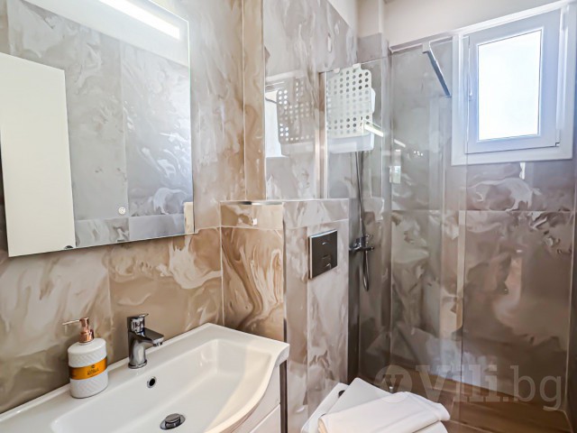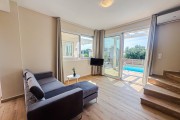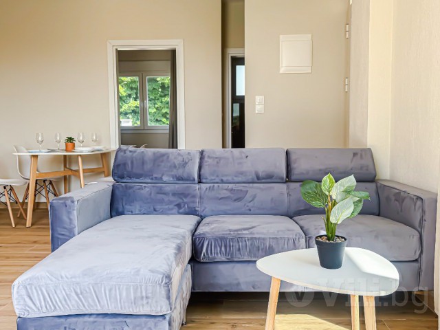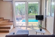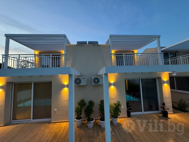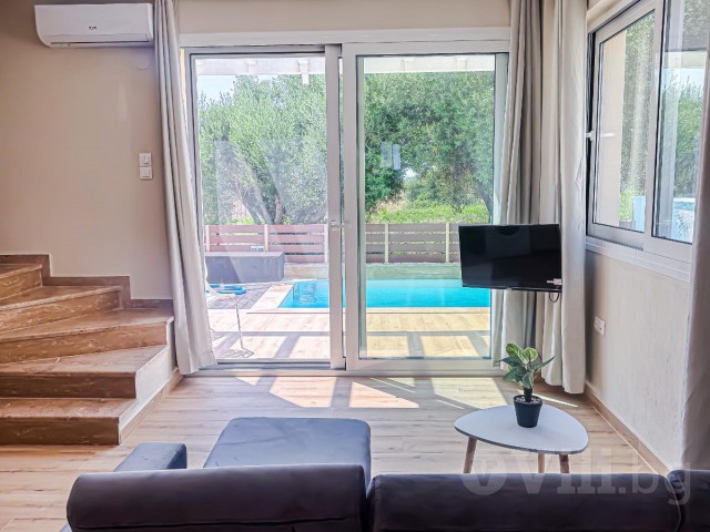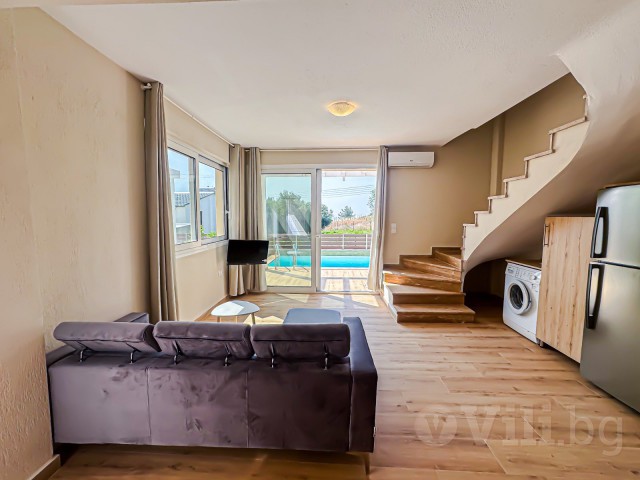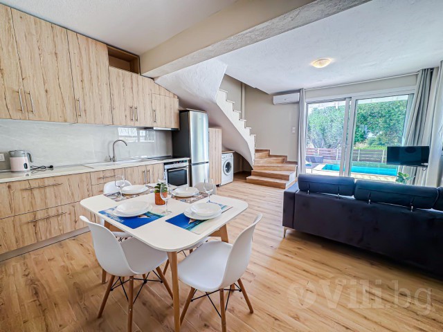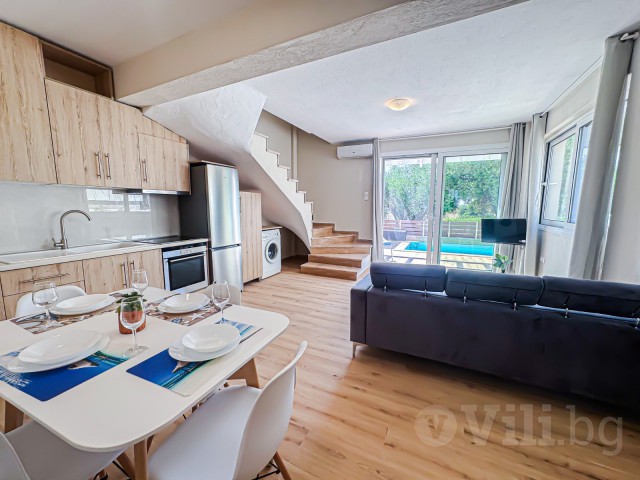 На първия етаж е разположена голяма всекидневна с мека мебел и телевизор. Кухнята е модерно обзаведена с всичко необходимо: еспресо машина, кана за вода, фрапе машина, сокоизтисквачка, тостер, миксер, голям хладилник и пералня. До нея е трапезарията за 5 човека. На етажа има спалня с гардероб и нощни шкафчета и модерна баня с тоалетна. От всекидневната се излиза директно към частния басейн с шезлонг.
