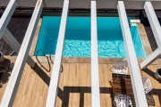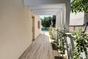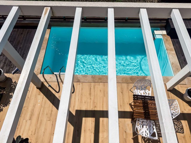 Тераса към частния басейн с шезлонг и чадър