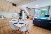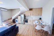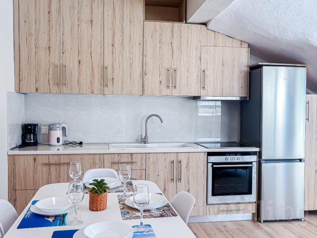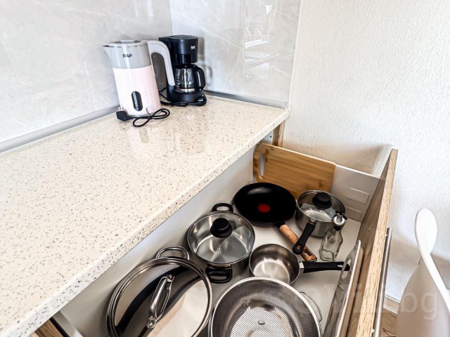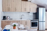 Напълно оборудвана кухня: котлони, фурна, хладилник с фризер, еспресо машина, кана за вода, фрапе машина, сокоизтисквачка, тостер, миксер, посуда за приготвяне и сервиране на храна