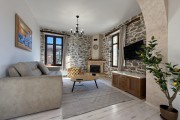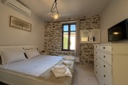 На първия етаж на Вила Ставрос има партерен едноспален апартамент. Той разполага с уютен хол с мека мебел, телевизор и камина, трапезария с маса за 6 човека и напълно оборудвана модерна кухня и климатик. В нея ще откриете, посуда, котлони, фурна, хладилник с фризер, абсорбатор, еспресо машина, електрическа кана, микровълнова фурна, фрапе машина и фреш машина. Апартамента има луксозна баня с тоалетна, заредена с консумативи. Спалнята е комфортна с климатик, разполага с голямо легло, тоалетки, гардероб и зона за гримиране с огледало, сешоар, ютия. От апартамента се излиза към оградена тераса, която е на главната улица с кът за релакс и барбекю. Пред терасата може да бъде паркиран един лек автомобил.