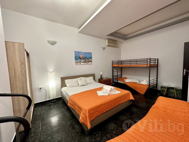 Две уютни спални, всяка оборудвана с едно двойно легло и две единични легла на два етажа