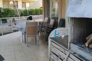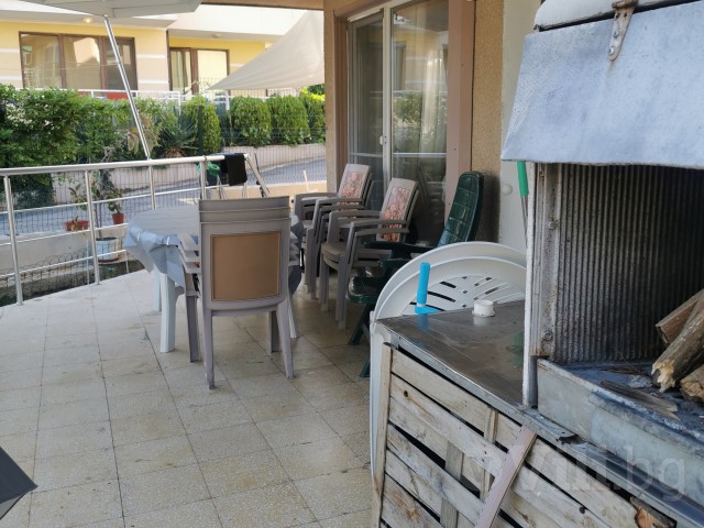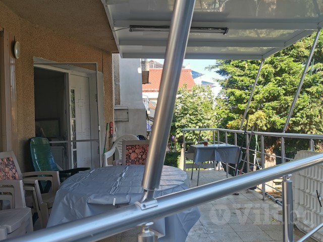 От дневната се излиза на голяма покрита веранда с барбекю и маса със столове за релакс и хранене.