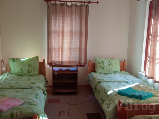 На два етажа. На първия етаж на разположение са две спални (преходни), кухня и трапезария. В едната спалня има две единични легла и едно легло персон и половина, а в другата спалня - две единични легла.